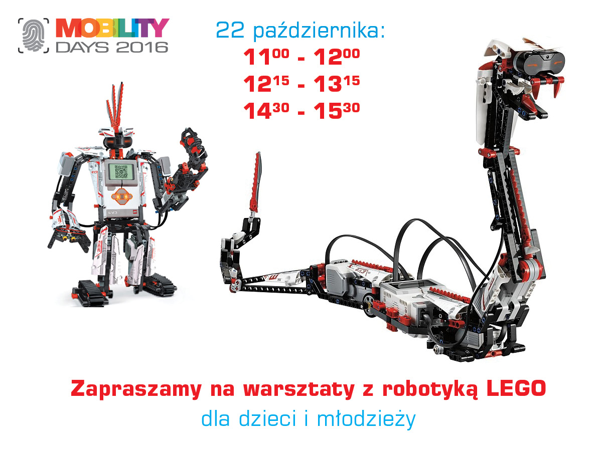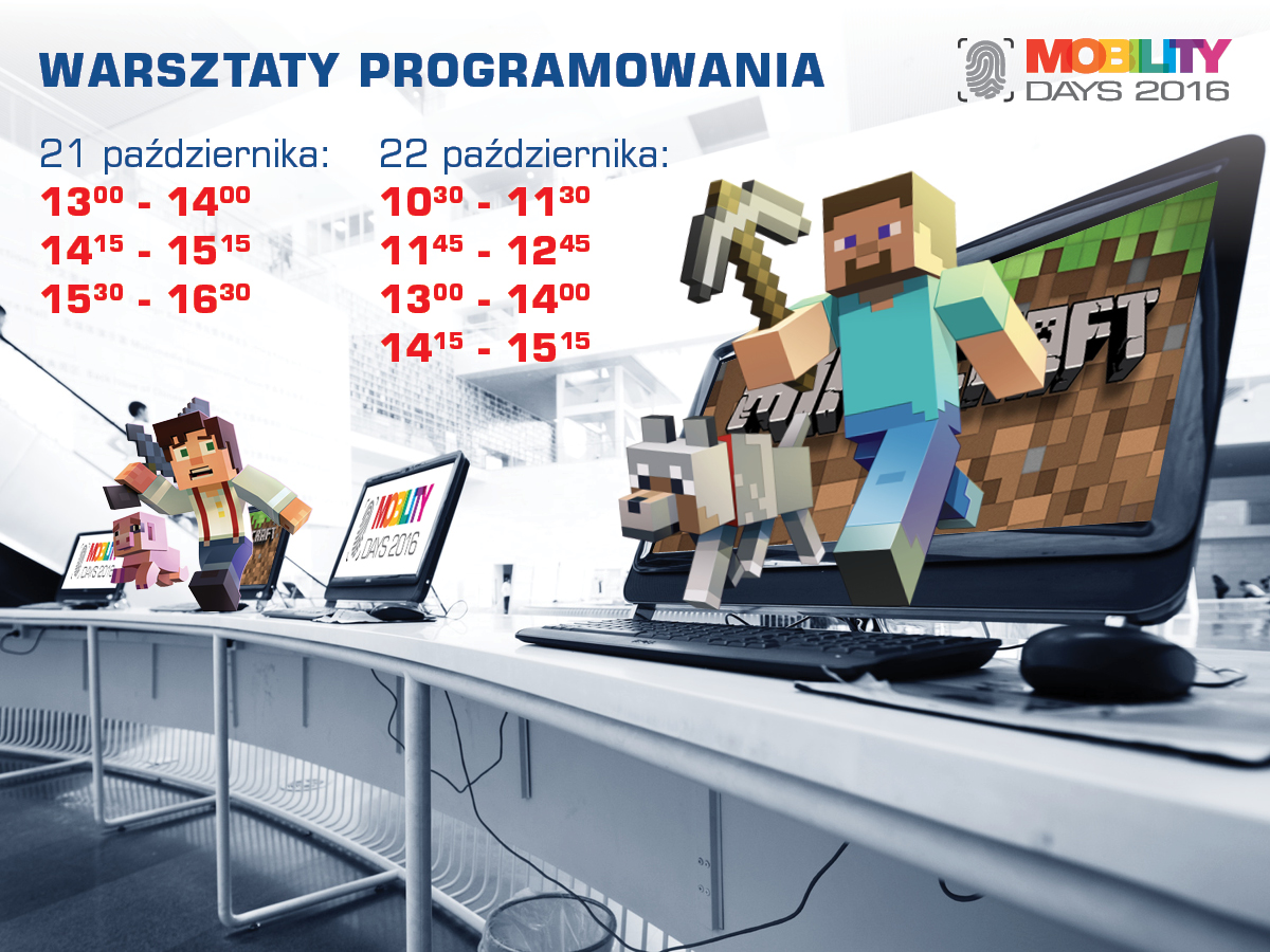 on 21 and 22 November there will be free workshops on programming in Minecraft for children and adolescents, through which they will realize they that your computer is not only used for games, and programming language will be the third mandatory that need to know. For preschoolers and elementary school workshops LEGO robots that not only support the work of the group, but above all, develop spatial thinking and the ability to design. Simply register on the website mobilitydays.pl to take part in them! Places are limited, so sign up as soon as possible!